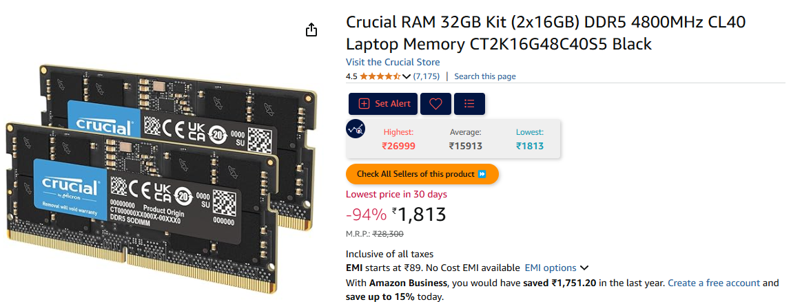 Crucial RAM 32GB Kit (2x16GB) DDR5 4800MHz CL40 Laptop Memory CT2K16G48C40S5 Black