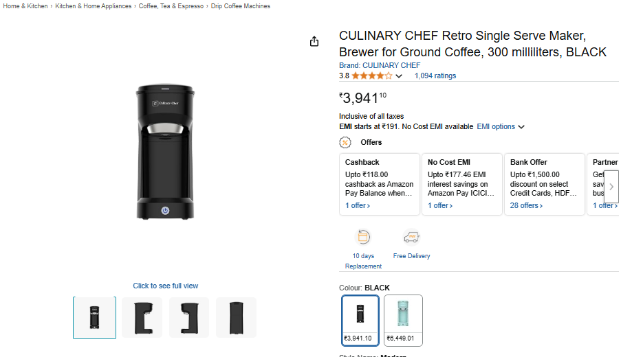 Preethi Cafe Zest Drip Coffee Maker| 450W Coffee Machine for Home | 500ml Capacity | Black (CM 210)