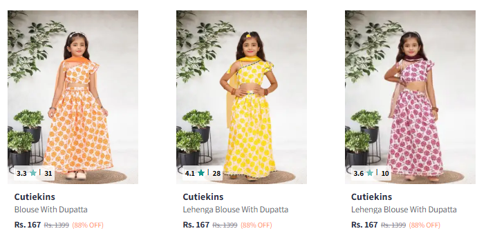 Cutiekins Girls Lehenga Choli Starting @ ₹167 available online in India at an offer price of ₹167 on Myntra. Discounted Price: ₹167. This deal was updated by @latika on 04th December, 2025 at 11:24 AM.