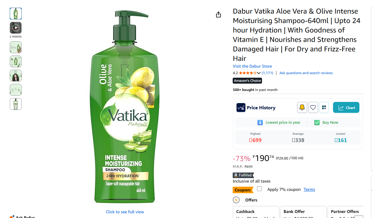 Dabur Vatika Aloe Vera & Olive Intense Moisturising Shampoo-640ml | Upto 24 hour Hydration | With Goodness of Vitamin E | Nourishes and Strengthens Damaged Hair | For Dry and Frizz-Free Hair