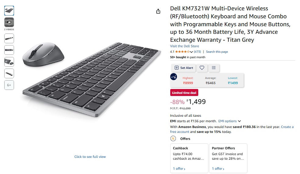 Dell KM7321W Multi-Device Wireless (RF /Bluetooth) Keyboard and Mouse Combo with Programmable Keys and Mouse Buttons, up to 36 Month Battery Life, 3Y Advance Exchange Warranty - Titan Grey