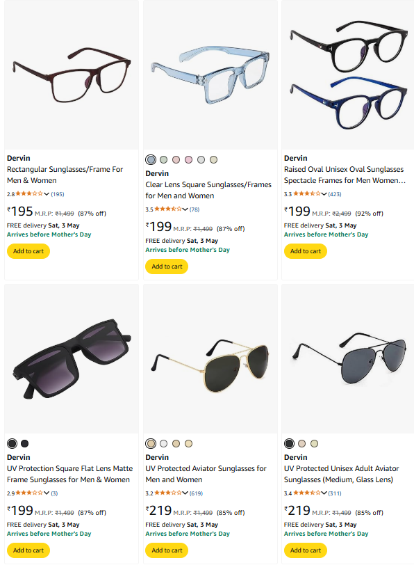 Dervin Sunglasses / Frame Minimum 85% Discount on Amazon