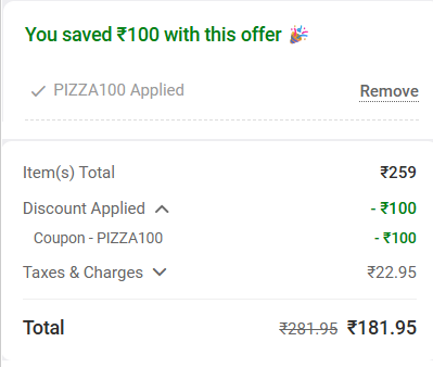- Use code PIZZA100 to get up to ₹100 off on orders of ₹249 or more.