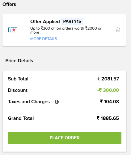 - Use code PARTY15 to get up to ₹300 off on orders of ₹2000 and above.