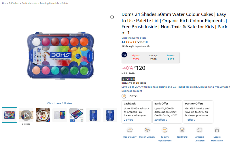 Doms 24 Shades 30mm Water Colour Cakes | Easy to Use Palette Lid | Organic Rich Colour Pigments | Free Brush Inside | Non-Toxic & Safe for Kids | Pack of 1.