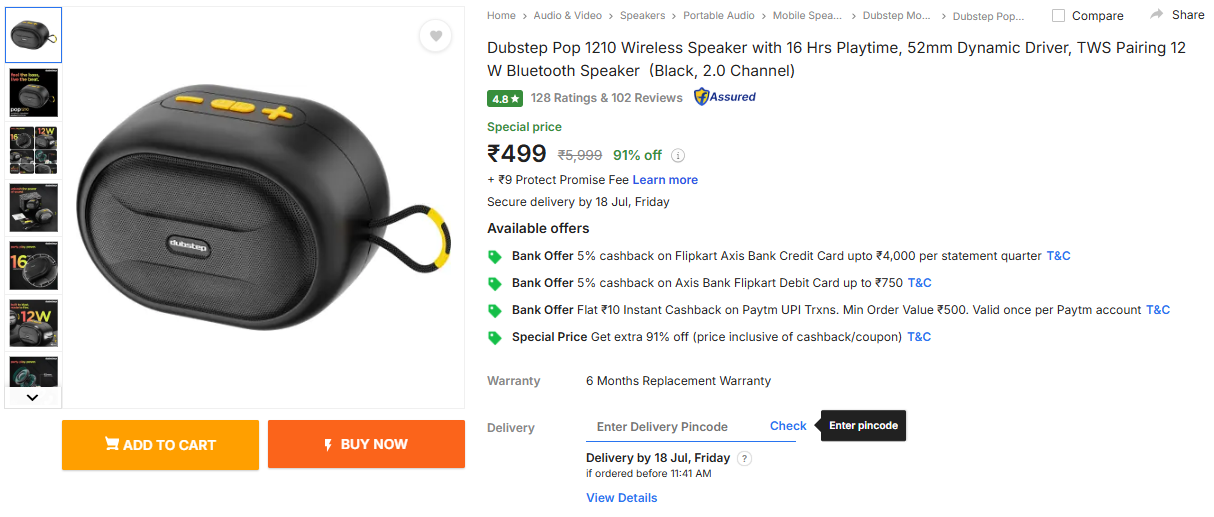 Dubstep Pop 1210 Wireless Speaker with 16 Hrs Playtime, 52mm Dynamic Driver, TWS Pairing 12 W Bluetooth Speaker (Black, 2.0 Channel).