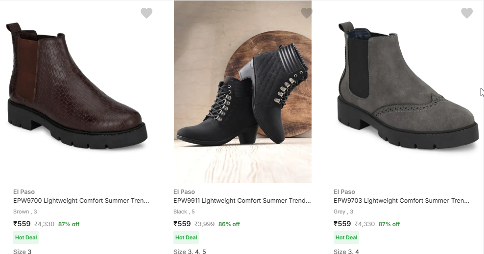 El Paso Women's Boots @ Minimum 80% Discount available online in India at an offer price of ₹539 (80% discount from MRP) on Flipkart. Discounted Price: ₹539. Discount: 80%. This deal was updated by @suresh on 02nd January, 2026 at 10:23 AM.