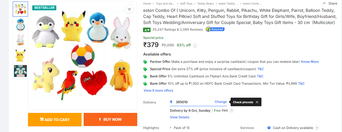 eston Combo Soft Toys (pack of 10) is available on Flipkart at an 83% discount , price at ₹379.