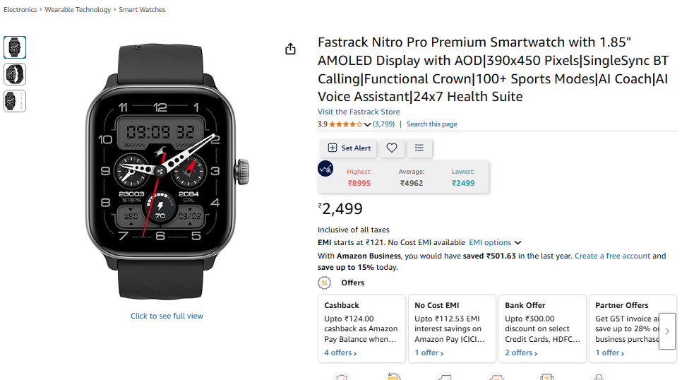 Fastrack Nitro Pro Premium Smartwatch with 1.85\' AMOLED Display with AOD|390x450 Pixels|SingleSync BT Calling|Functional Crown|100+ Sports Modes|AI Coach|AI Voice Assistant|24x7 Health Suite.