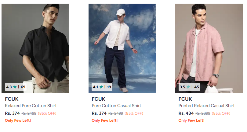 FCUK Men's Fashion @ Up to 85% Discount available online in India (85% discount from MRP) on Myntra. Discount: 85%. This deal was updated by @suresh on 10th March, 2026 at 1:13 PM.