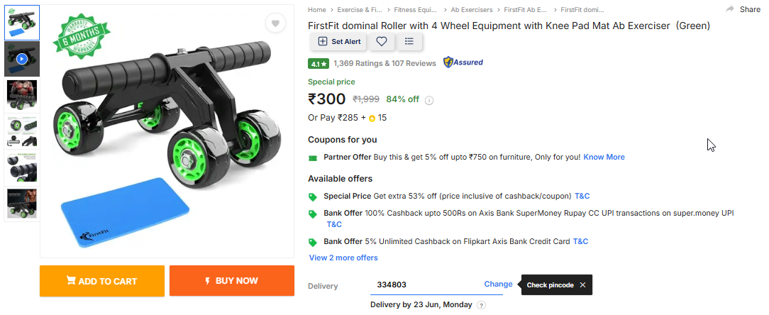 FirstFit dominal Roller with 4 Wheel Equipment with Knee Pad Mat Ab Exerciser (Green).