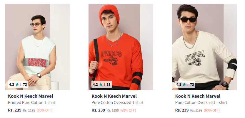 Flat 80% Discount on Kook N Keech Marvel Men's T-Shirts is available on Myntra.