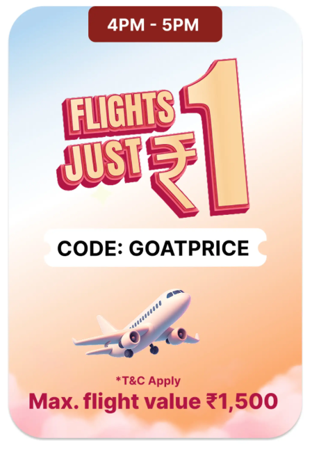 🎉 Flipkart Crazy Hours Offer: Flights for just ₹1 for Max. value ₹1,500 (book 4 PM - 5 PM) Use code: GOATPRICE.