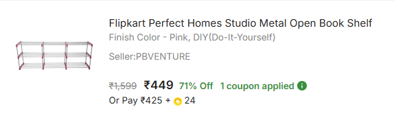 Flipkart Perfect Homes Studio Metal Open Book Shelf (Finish Color - Pink, DIY(Do-It-Yourself)) is available on Flipkart.