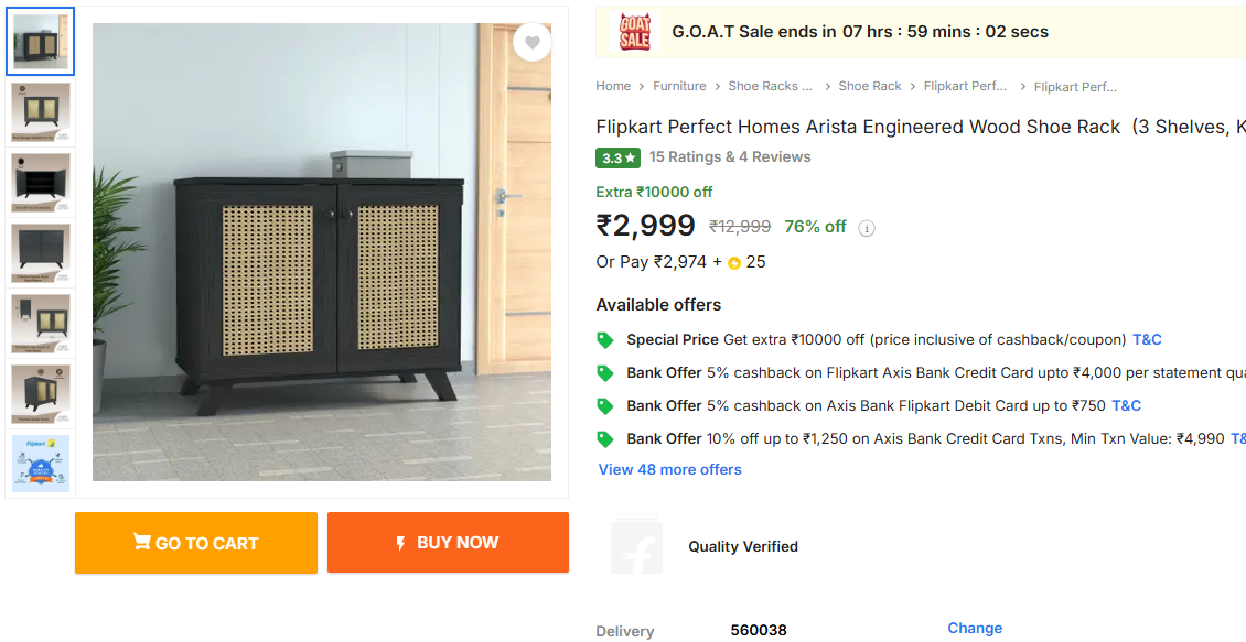 Flipkart Perfect Homes Arista Engineered Wood Shoe Rack (3 Shelves, Knock Down)