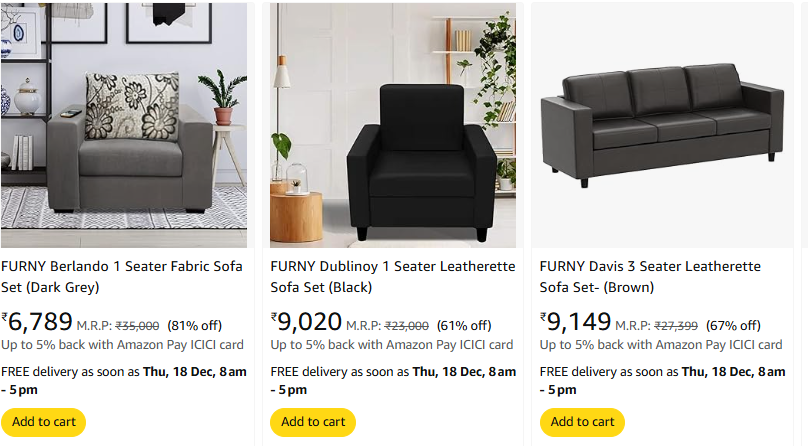 FURNY Sofa Set Upto 81% Discount on Amazon.