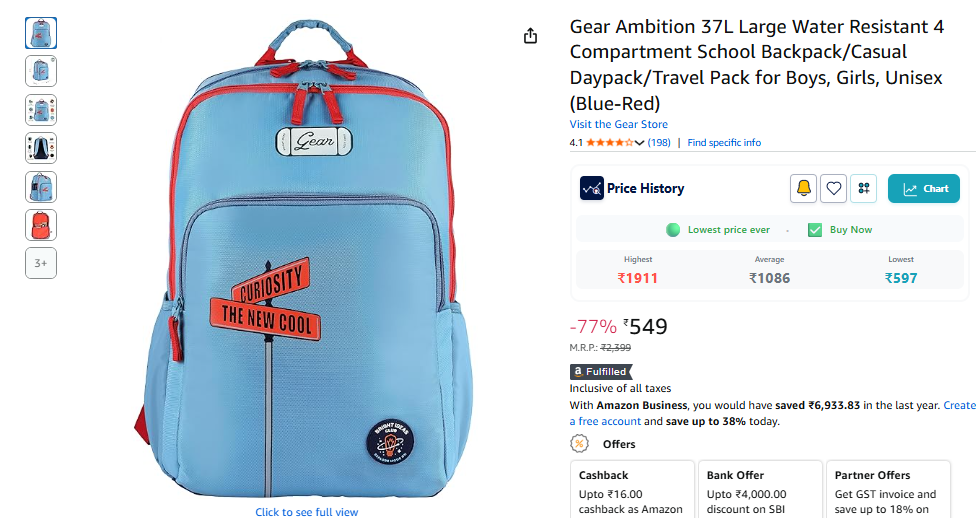 Gear Ambition 37L Large Water Resistant School Bag/Casual Backpack/Daypack/Kids Bag/College Bag.