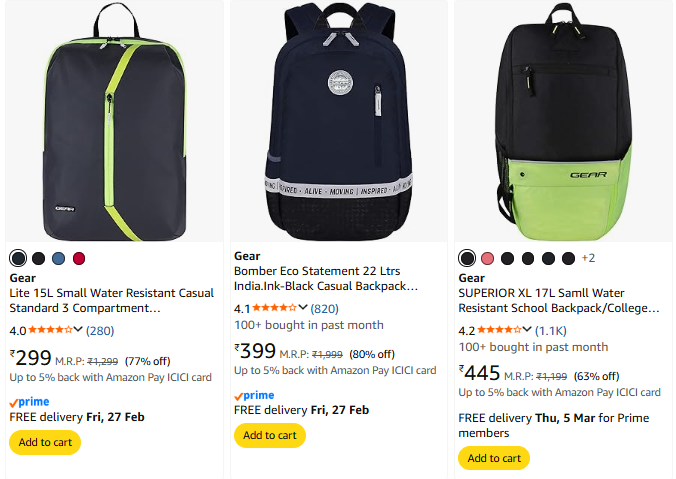 Gear Backpack Starting @ ₹299 on Amazon.