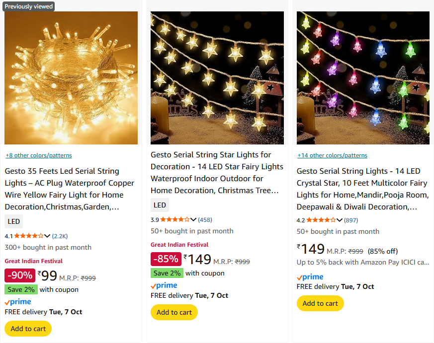 Gesto Led String Lights Starting @ ₹99 | Upto 90% Discount on Amazon.