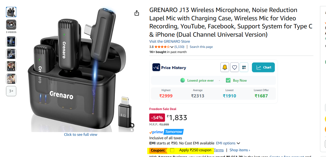 GRENARO J13 Wireless Microphone, Noise Reduction Lapel Mic with Charging Case, Wireless Mic for Video Recording, YouTube, Facebook, Support System for Type C & iPhone (Dual Channel Universal Version) is available on Amazon.