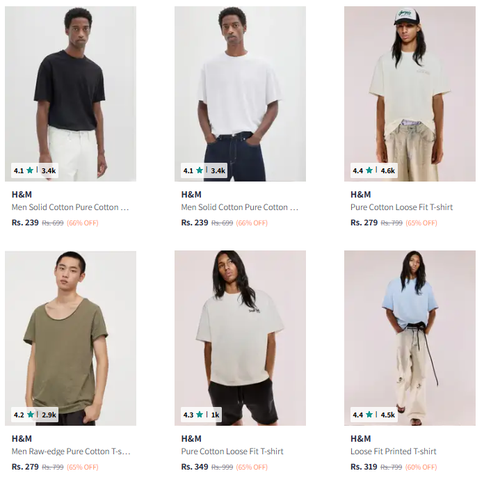 H&M Loose Fit T-Shirt @ Starting ₹239 available online in India at an offer price of ₹239 (66% discount from MRP) on Myntra. Discounted Price: ₹239. Discount: 66%. This deal was updated by @suresh on 08th December, 2025 at 11:39 AM.