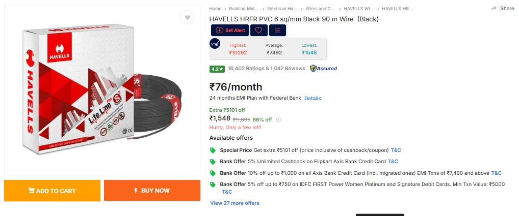 HAVELLS HRFR PVC 6 sq/mm Black 90 m Wire (Black).