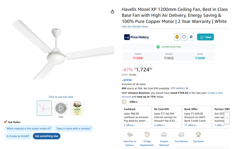 Havells Mozel XP 1200mm Ceiling Fan, Best in Class Base Fan with High Air Delivery, Energy Saving & 100% Pure Copper Motor | 2 Year Warranty | White