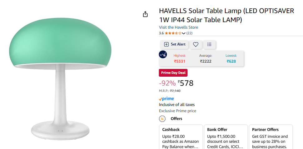 HAVELLS Solar Table Lamp (LED OPTISAVER 1W IP44 Solar Table LAMP)