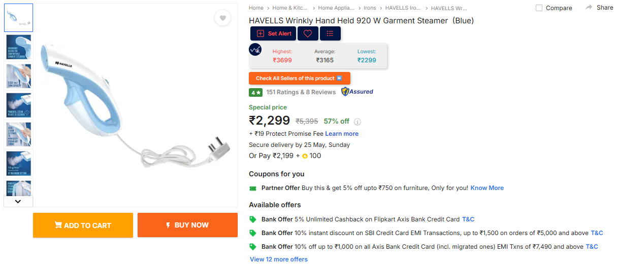 HAVELLS Wrinkly Hand Held 920 W Garment Steamer (Blue).