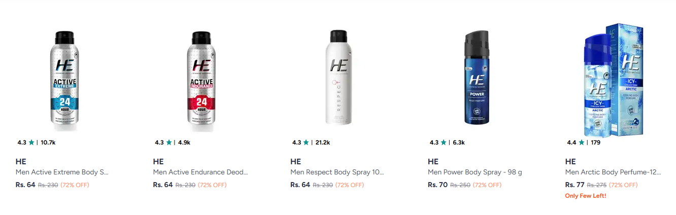 HE Deodorants starting at ₹64 is available on Myntra.
