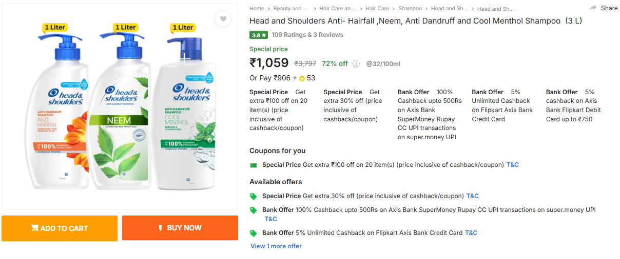 Head and Shoulders Anti- Hairfall ,Neem, Anti Dandruff and Cool Menthol Shampoo (3 L)