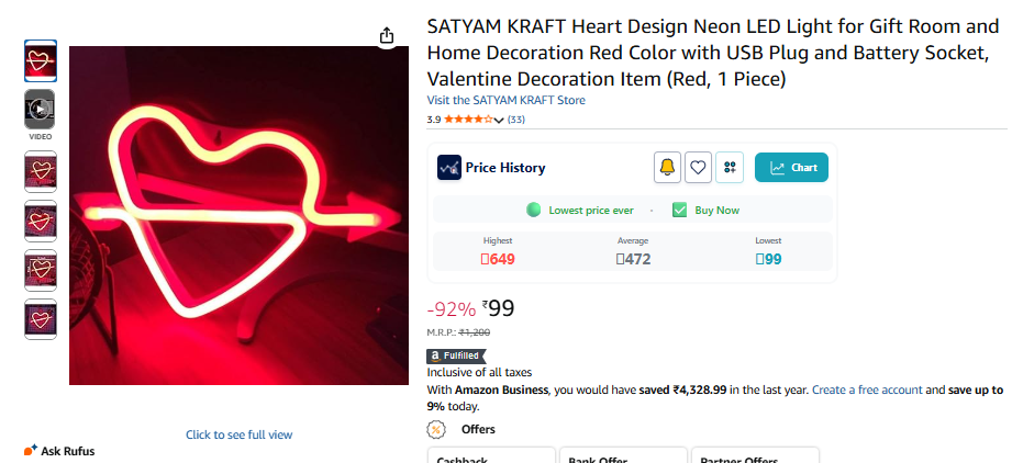 SATYAM KRAFT Heart Design Neon LED Light for Gift Room and Home Decoration Red Color with USB Plug and Battery Socket, Valentine Decoration Item (Red, 1 Piece)
