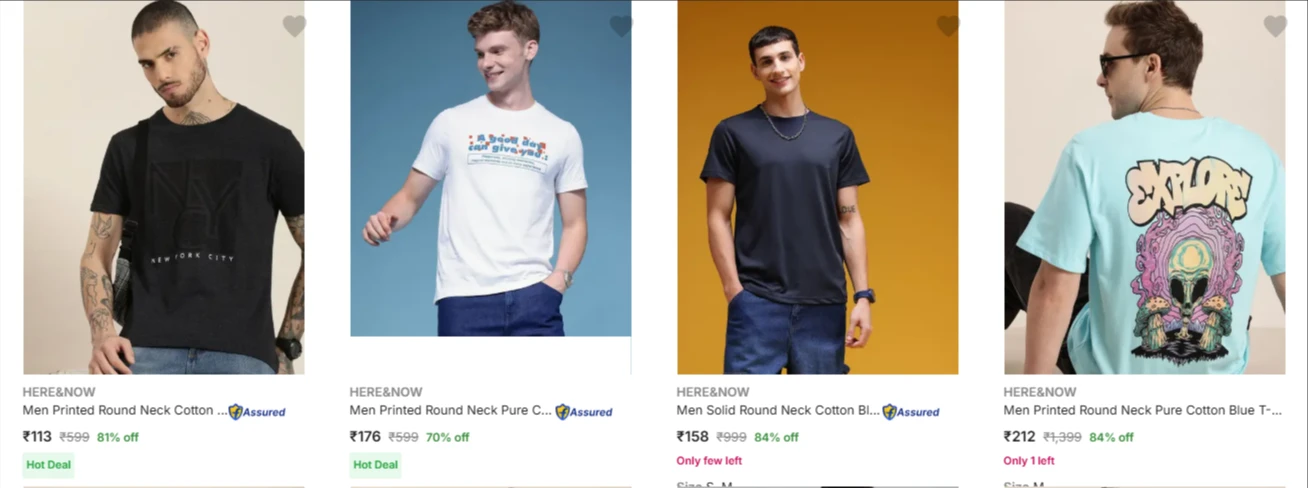 Here & Now Men's T-Shirts at minimum 70% Discount is available online in India (70% off) on Flipkart.