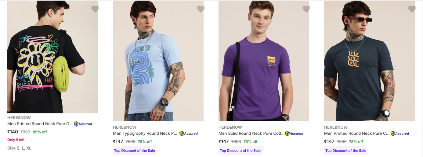 Here & Now Men's T-Shirts upto 85% Discount is available on Flipkart.