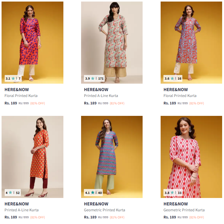 Here & Now Women's Kurta @ Flat ₹189 available online in India at an offer price of ₹189 (81% discount from MRP) on Myntra. Discounted Price: ₹189. Discount: 81%. This deal was updated by @suresh on 16th December, 2025 at 10:16 AM.
