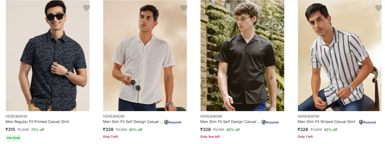 Here & Now Men's Casual Shirts at minimum 70% Discount is available online in India (70% off) on Flipkart.