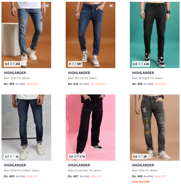 HIGHLANDER Brand Men's Jeans @ Minimum 80% Discount, Available on Myntra.