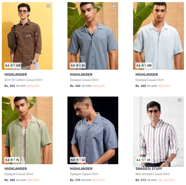 HIGHLANDER Brand Men's Shirts @ Minimum 80% Discount, Available on Myntra.