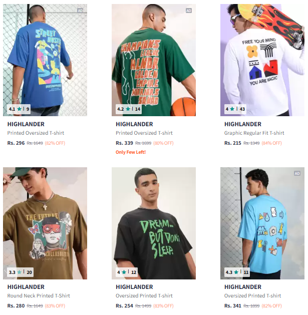HIGHLANDER Brand Men's T-shirts @ Minimum 80% Discount, Available on Myntra.