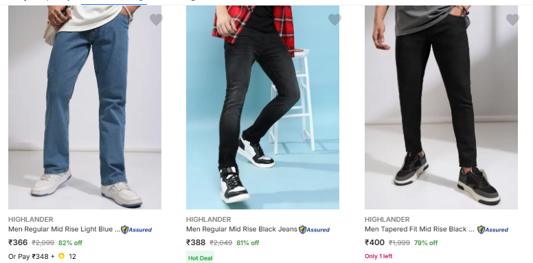 HIGHLANDER Men's Jeans @ Up to 82% OFF, Available on Flipkart.