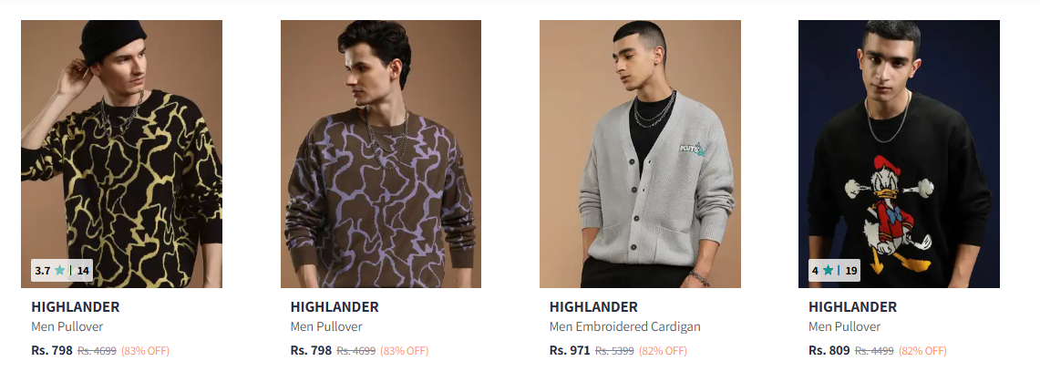 Highlander Men's Sweaters upto 83% Discount is available on Myntra.