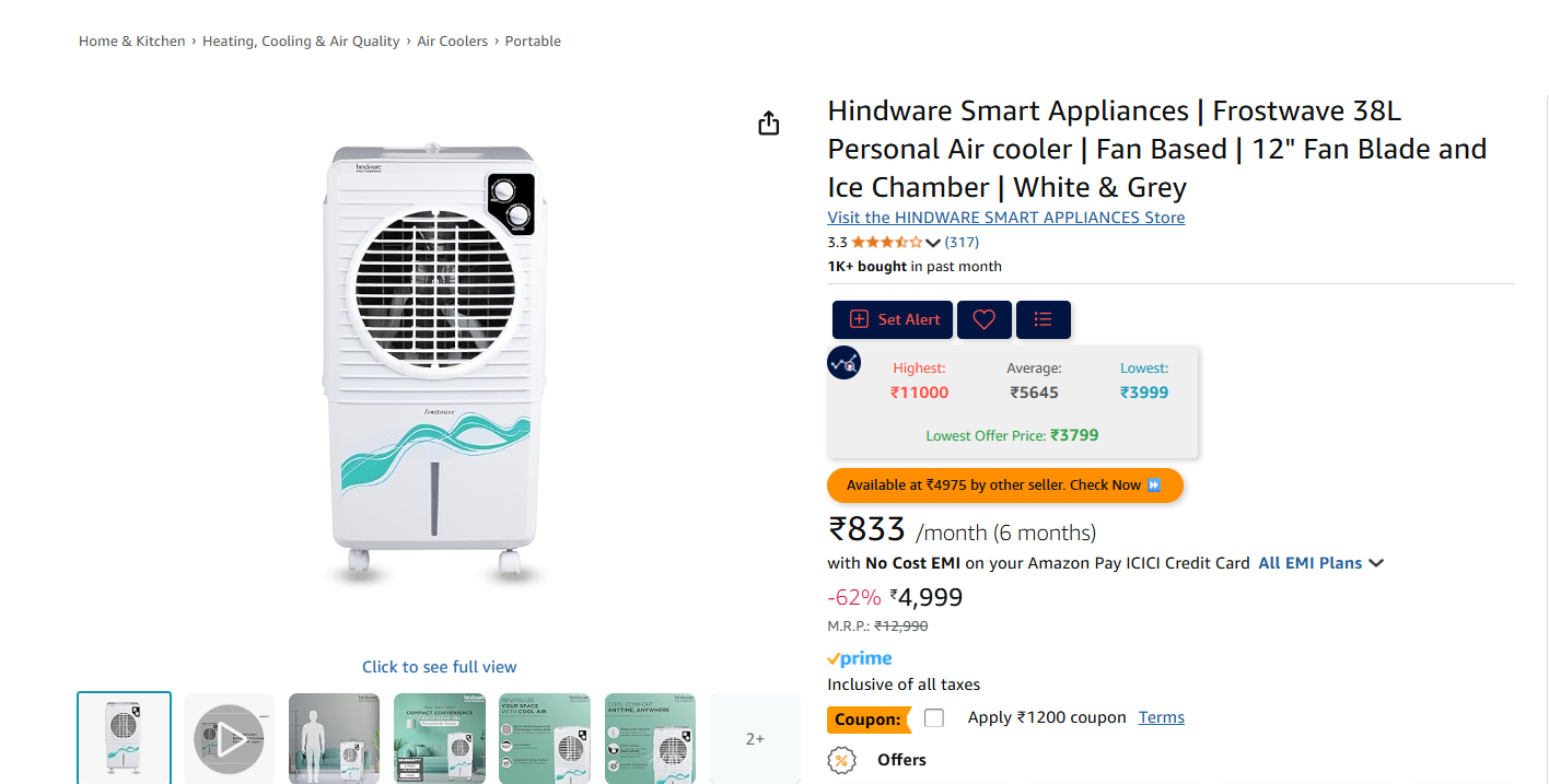 Hindware Smart Appliances FROSTINE 37L Personal Air Cooler Inverter Compatible with High Air Delivery Technology, Humidifier, Ice Chamber, Homeycomb Pads, Insect and Dust Free Filter (Black & White)