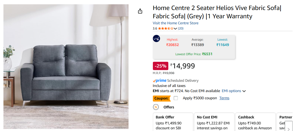Home Centre 2 Seater Helios Vive Fabric Sofa| Fabric Sofa| (Grey) |1 Year Warranty available online in India at an offer price of ₹9999 (50% discount from MRP) on Amazon. Offer Note: Apply Rs.5000 Coupon. Discounted Price: ₹9999. MRP: 19998. Savings: ₹9999. Discount: 50%. This deal was updated by @gopal on 31st July, 2025 at 8:13 PM.