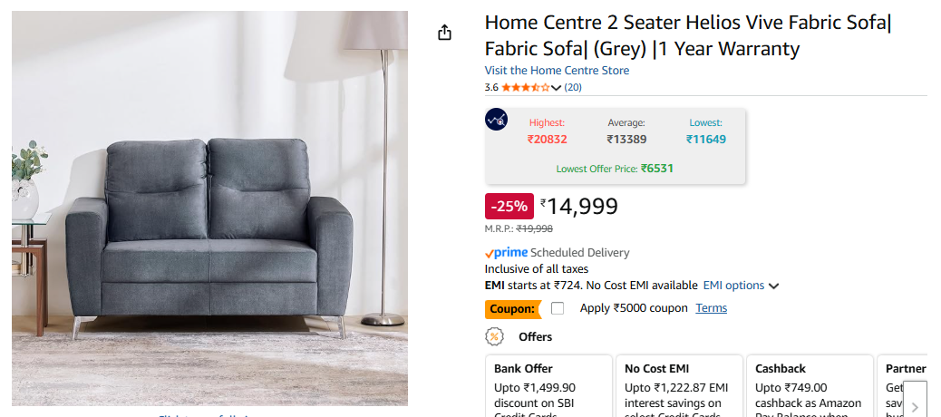 Home Centre 2 Seater Helios Vive Fabric Sofa| Fabric Sofa| (Grey) |1 Year Warranty available online in India at an offer price of ₹9999 (50% discount from MRP) on Amazon. Offer Note: Apply Rs.5000 Coupon. Discounted Price: ₹9999. MRP: 19998. Savings: ₹9999. Discount: 50%. This deal was updated by @gopal on 31st July, 2025 at 8:20 PM.