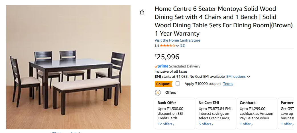 Home Centre 6 Seater Montoya Solid Wood Dining Set with 4 Chairs and 1 Bench | Solid Wood Dining Table Sets For Dining Room|(Brown) 1 Year Warranty available online in India at an offer price of ₹15996 (64% discount from MRP) on Amazon. Offer Note: Apply Rs.10000 Coupon. Discounted Price: ₹15996. MRP: 44999. Savings: ₹29003. Discount: 64%. This deal was updated by @gopal on 31st July, 2025 at 8:56 PM.