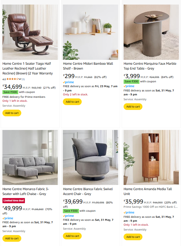 Home Centre Store Standard Sofa & Wood Product @ Up to 82% Discount, Available on Amazon.