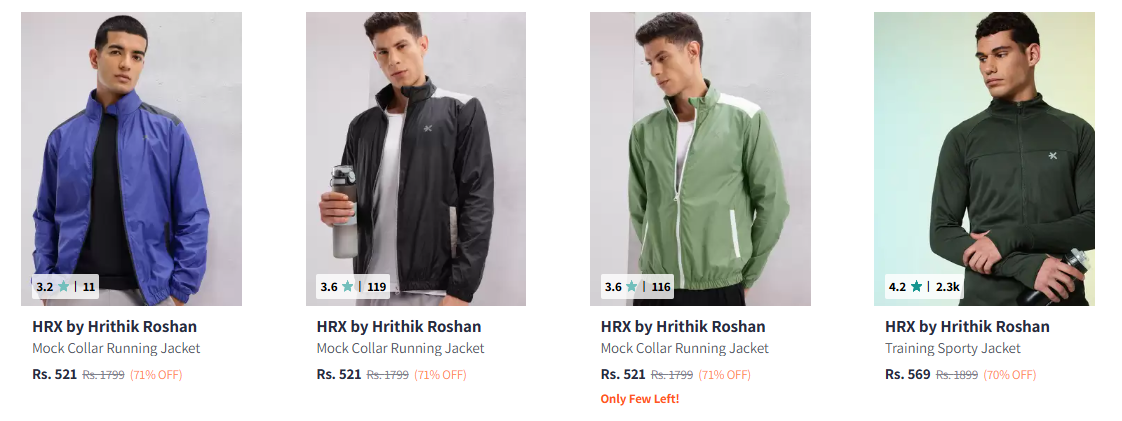 HRX by Hrithik Roshan Men's Jackets at minimum 70% Discount is available on Myntra.