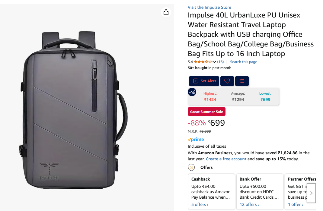 Impulse 40L UrbanLuxe PU Unisex Water Resistant Travel Laptop Backpack with USB charging Office Bag/School Bag/College Bag/Business Bag Fits Up to 16 Inch Laptop