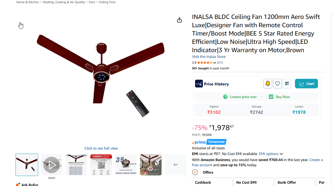 INALSA BLDC Ceiling Fan 1200mm Aero Swift Luxe|Designer Fan with Remote Control Timer/Boost Mode|BEE 5 Star Rated Energy Efficient|Low Noise|Ultra High Speed|LED Indicator|3 Yr Warranty on Motor,Brown.