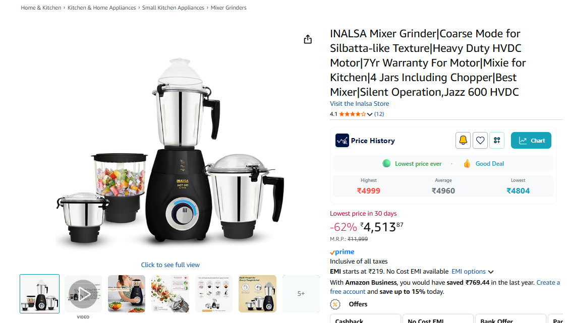 INALSA Mixer Grinder |Coarse Mode for Silbatta-like Texture |Heavy Duty HVDC Motor |7Yr Warranty For Motor |Mixie for Kitchen |4 Jars Including Chopper |Best Mixer |Silent Operation,Jazz 600 HVDC
